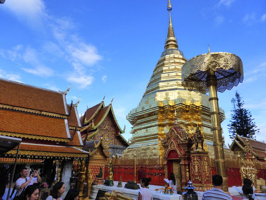 Da sich seit zwei Tagen die Wolkendecke verzogen hat, haben wir eine gute Sicht auf Chiang Mai und bis zu den Bergen. Den Mittelpunkt des Tempels bildet die große goldene Pagode um die herum viele verschiedene Buddhastatuen plaziert sind. Die Gläubigen drehen mit einer Lotusblume in der Hand eine Runde um die Pagode und entzünden Kerzen und Räucherstäbchen. An einer Stelle stehen viele verschiedene Boxen, die aussehen wie beschriftete Minibriefkästen. Die Schildchen sagen aus, wem die ganz gezielte Spende zugute kommt. Zum Beispiel dem Erhalt verschiedener Tempel, der Unterstützung bestimmter Mönche und sogar ein Radiosender ist dabei. Die Regeln des Respekts schreiben eigentlich vor, dass man im Vorbeigehen an den Mönchs- und Buddhastatuen den Kopf nicht auf gleicher Höhe oder höher haben darf. Die Thais halten sich zum Teil dran aber für uns Europäische Riesen ginge das bei manchen nur, wenn wir in der Hocke vorbei gingen. Die Kinder bekommen noch je eine Lotusblume und dann haben wir auch diesen Tempel abgehakt.