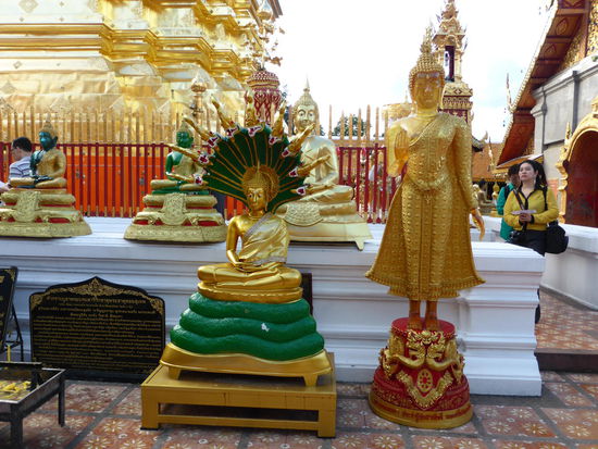 Dann ziehen wir schnell in das andere Haus um, um näher bei unseren Freunden zu sein. Es ist der Teil der Hotelanlage, der nach hinten zu den Reisfeldern raus geht. Wir schaffen es fast in einem Schwung; das was wir vergessen, tragen uns die aufmerksamen Angestellten nach. Dann geht es zur Massage, Massage. Diesmal nehme ich die Thaimassage, aber sie ist ganz schön lasch und ich werde kaum verbogen. Im Anschluss daran fahren wir in unser inzwischen als Stammlokal zu bezeichnendes Restaurant und dann hoch zum Doi Suthep. Dieser Berg ist quasi der "Hausberg" Chiang Mais und beherbergt den vom König in Auftrag gegebenen Tempel der Kategorie A. Davon gibt es nur 24 Stück in ganz Thailand. Die Ausläufer der mal wieder langen und steilen Treppe enden in einem mehrköpfigen Drachenkörper und das Getier des Regenwaldes drumherum schlägt ein schrill-lautes Konzert an.