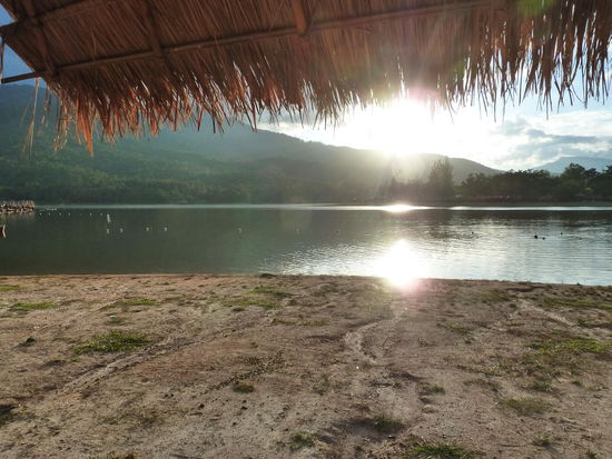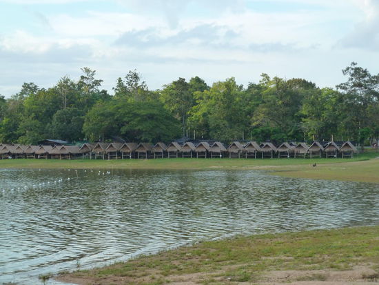 An einem anderen Abschnitt sehen wir und zunächst die Karte an und werden dabei freundlich begrüßt. Alles bestens also bleiben wir hier. Wir bestellen 10 verschiedene Gerichte und für jeden Getränke dazu. Nach dem Essen bleiben wir noch ein paar Stunden, faulenzen, baden und genießen den malerischen Blick über den See bis zu den Bergen. Als die Sonne langsam hinter den Bergen versinkt, ist es Zeit zu gehen, denn dann kommen die Mücken. Fuer das ganz Essen und die Getraenke bezahlen wir hier nur 800 Baht. Wir drehen zum Abschluss noch eine Runde mit dem Auto um den See. Der scheint bei den sportlichen Thais sehr beliebt zu sein, denn es sind viele auf Rennrädern unterwegs oder joggen. Leider fahreN die zum Teil mitten auf der Straße, so dass Rene einmal so weit nach links ausweichen muss, dass die Räder auf der linken Seite schon im Graben hängen und ich befürchte, dass wir gleich umkippen. Den Rückweg zum Hotel schaffen wir in vierzig Minuten.