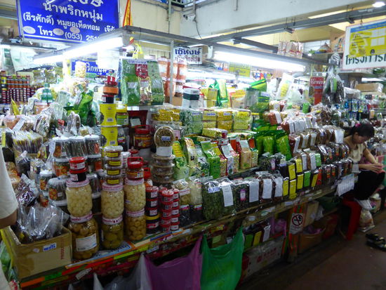 Das ist eine riesige dreistöckige Markthalle, die durch eine kleine Straße in zwei Teile geteilt ist. Im ersten Teil gibt es hauptsächlich Kleidung, getrocknete Früchte, Gewürze, frisches Obst und Gemüse, religiöse Devotionalien und Holzarbeiten. Ilka und ich kaufen uns jede einen von diesen großen Holzmörsern, in denen die Thais den köstlichen Papayasalat Som Tam zubereiten, den wir beide so gut wie jeden Tag hier essen. Wie man ihn zubereitet wissen wir schon, dann können wir ihn auch zu Hause professionell zubereiten, denn das Geheimnis des guten Geschmacks besteht unter anderem darin, dass die Papayastreifen in der Sauce gestampft werden und in diese etwas Saft abgeben. Im zweiten Teil des Marktes gibt es hauptsächlich einfaches Haushaltsgerät und Chinesische Devotionalien. An einem Stand für Messer erstehen wir ein paar in verschiedenen Größen, die unglaublich scharf und billig sind.