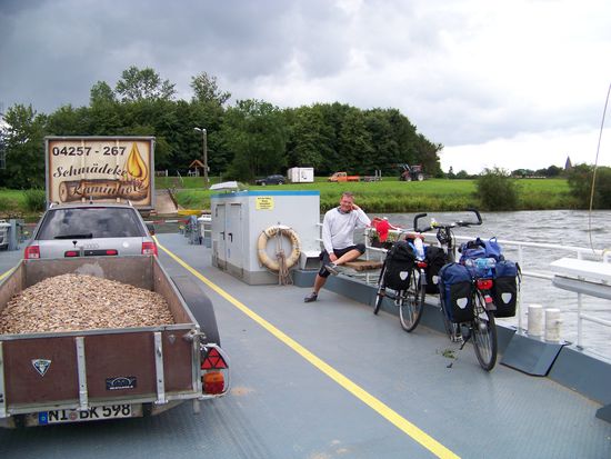 Bei Schweringen nehmen wir über die Weser die Seilfähre. Mittlerweile stürmt es schon wieder.