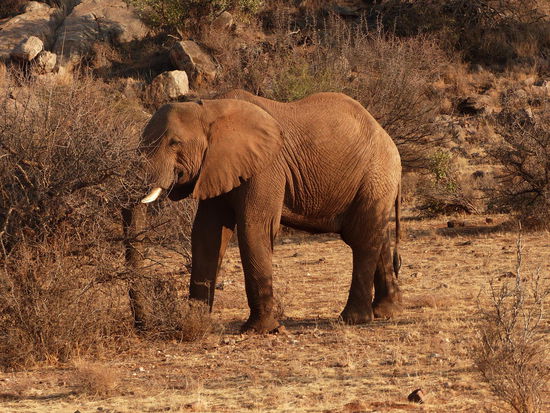 Nun entdecken wir einen Elefant der an einem vertrockneten Strauch knabbert (obwohl andere Sträucher noch schön grün wären), ehe wir viele Geier kreisen sehen, was ein Indiz auf Aas und u.U. ein großes Raubtier ist.