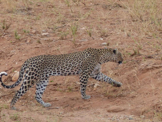 Als dann aber ein anderes Auto zurück fährt, stoßen wir weiter nach vorne; und da ist er, majestätisch und wunderschön sitzt ein Leopard, perfekt sichtbar am Abhang!