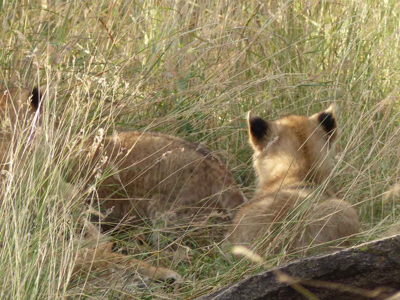Als wir wieder weiter fahren wollen, wir sind off-road, was eigentlich verboten ist, gibt es plötzlich noch was zu sehen: die Löwin hat 6(!) Kleine, die am und auf dem Felsen herumtollen: total süß!