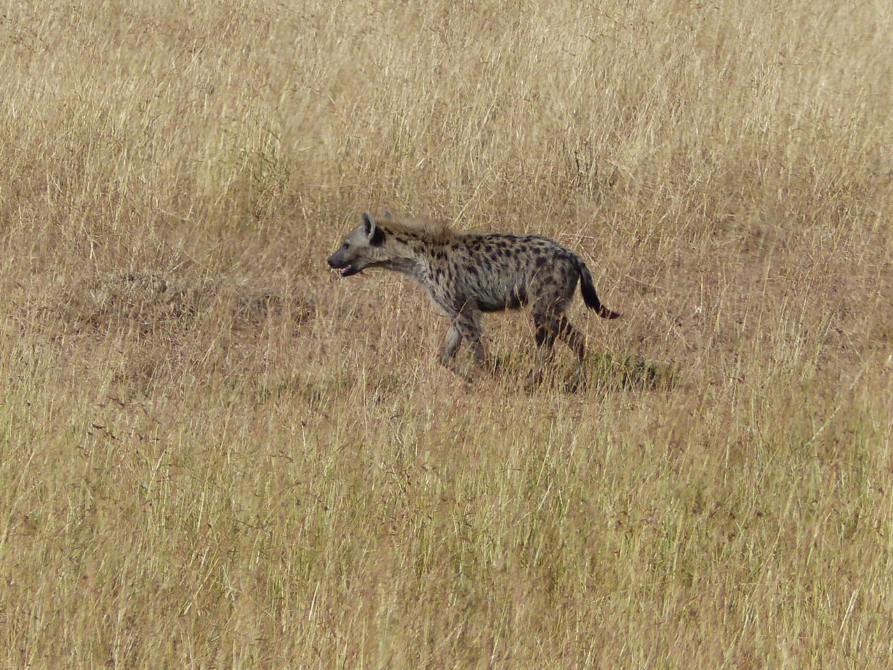 Nun kommen noch Büffel, noch mehr Hyänen, ein sehr, sehr scheuer Streifenschakal, Topis und Kuhantilopen hinzu und zum Abschluss noch ein einzelner Elefantenbulle, ehe wir nach 4 Aufsetzern beim 5. mal sicher in der Mara landen...