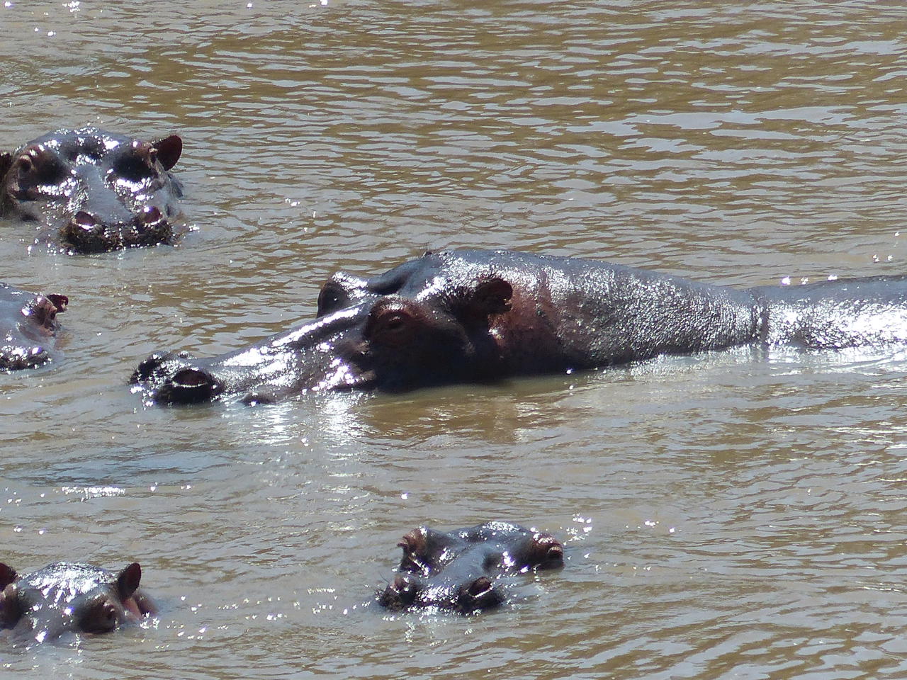 Dort ist es endlich wieder tierreicher: erst kommen die Hippos, die im Fluss baden und grunzen.