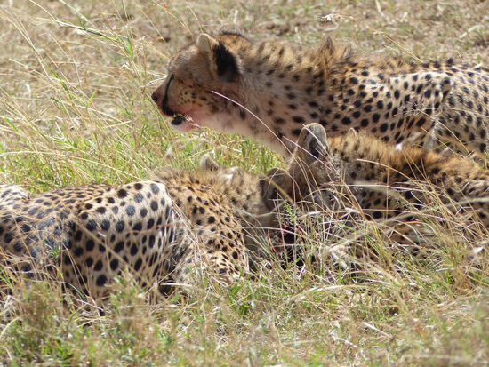 Die 3 Gepardenbrüder von gestern mit frischer Beute, direkt an der Straße beim Fressen!