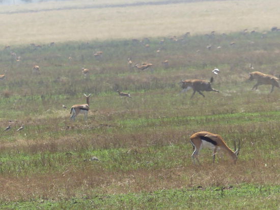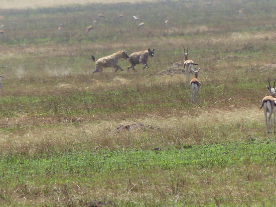 Es geht Schlag auf Schlag weiter, denn während die Geparden noch am Fressen sind und sich die gejagte Herde soeben erst beruhigt hat, kommen tatsächlich 2 Hyänen angeschlichen!