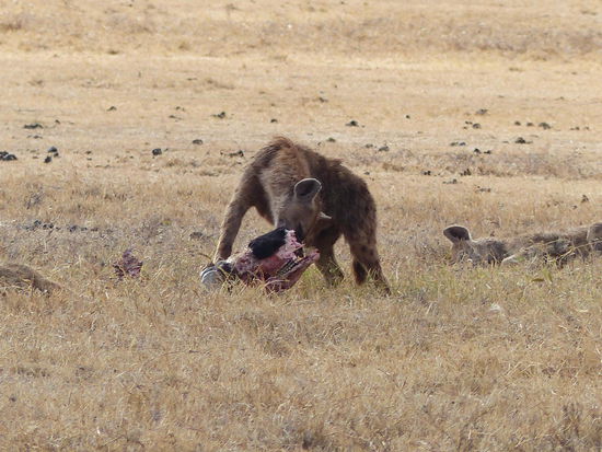 Bald treffen wir auch auf ein erstes Rudel Hyänen, welches sich gerae über einen Gnukadaver hermacht