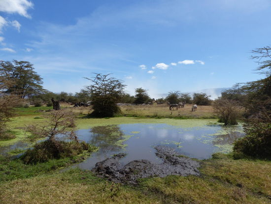 Dann ist erst mal kurz Pause, ehe es vorbei an einem wunderschönen Wasserloch mit Zebras, Büffeln und Wildenten weiter durch die wunderbare vulkanische Szenerie geht.