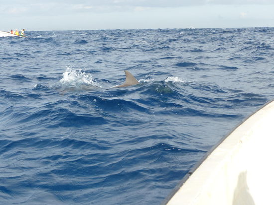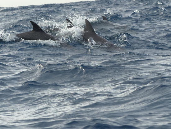 Bald bekommen wir sie zu sehen: schon als wir ankommen springen 3 Delfine aus den doch großen Wellen heraus!