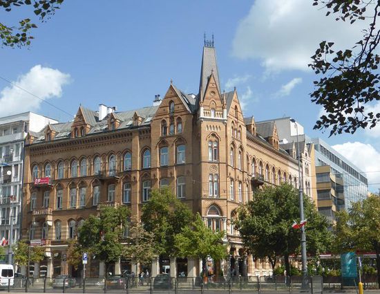 Auf dem Weg zum etwa 500 m entfernten Rondo Dmowskiego, benannt nach Roman Dmowski (1864-1939), der als Vater des polnischen Nationalismus gilt, säumen bereits alte und moderne Gebäude den weg. .