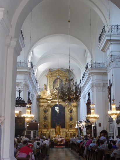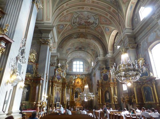 Im Inneren wird man vom Berock fast erschlagen. Alles ist vergoldet, die Deckengemälde sind üppig ausgemalt und eine wunderschöne Orgel wird wegen der guten Akustik in der Kirche regelmäßig zu Konzerten gespielt.
