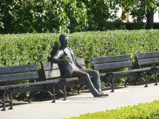 Hier in der Oase der Ruhe finden wir zum ersten Mal eine der im Führer angegebenen marmornen Chopin-Bänke. Die Zeitschrift die Zeit scheint wenig damit anfangen zu können: "Die Stadt feiert den 200. Geburtstag ihres berühmten Sohns im großen Stil mit renovierten Gedenkstätten, Festivals, Konzerten, Kongressen und dem traditionsreichen Klavierwettbewerb im Herbst. Aber schon die neuen Chopin-Sitzbänke in der Innenstadt haben etwas Unwirkliches. Sie sind aus dem schwarzen polierten Marmor, aus dem man Ehrenmale für Friedhöfe macht. Man hat sie pünktlich zum Jubiläum an vierzehn Stellen unter freiem Himmel aufgestellt. Die eingravierten Hinweistexte erklären den Zusammenhang zwischen dem jeweiligen Ort und dem Leben des Komponisten. Und auf Knopfdruck erklingt von irgendwoher zart scheppernd eine Mazurka, ein Walzer oder ein Nocturne. Als niste in Warschau Chopinsche Klaviermusik in jeder Bordsteinfuge."