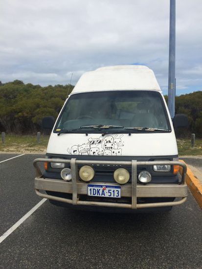 Unser Campervan ist echt cool! Wir haben alles was wir brauchen: einen Kühlschrank, Strom, einen Tisch & Bett. Und der ist fast genauso alt wie Dennis und ich Also Baujahr 1995, aber noch gut in Schuss!