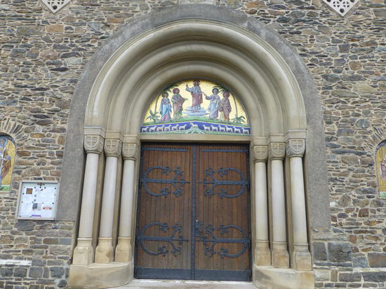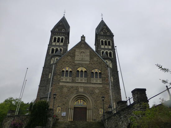 Einen Parkplatz finden wir zentral im Ort Clervaux, der bereits zu den Ardennen gehört. Drei Bauten beherrschen die 4.600 Einwohner Gemeinde im Tal des Flüsschens Clerf. Die Benediktinerabtei, die dominierende Pfarrkirche sowie das weiß getünchte Schloss. Wir beginnen unseren Rundgang mit der Pfarrkirche, die im neoromanischen Stil fast schon modern wirkt.