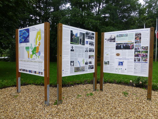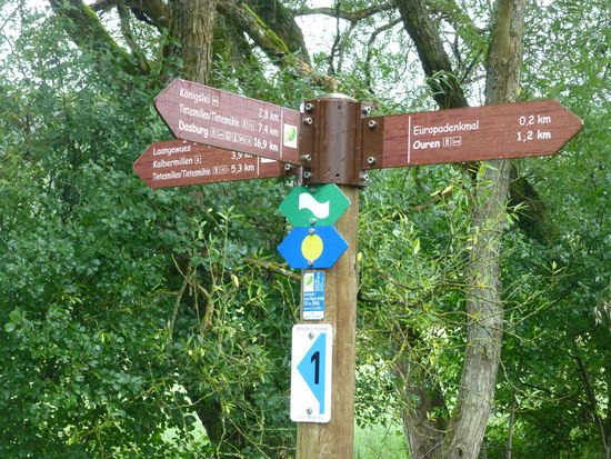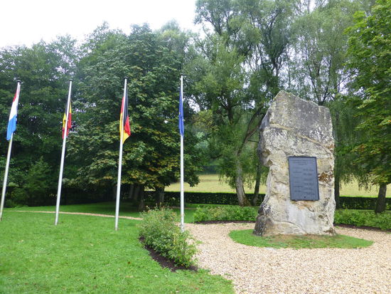 Das 3-Länder-Eck mit einem Europadenkmal befindet sich etwa einen Kilometer unterhalb des Örtchens Ouren. Wir sind mutterseelenallein hier. Irgendwie im berühmten "Middle-of-nowhere". Das Denkmal wurde 1977 errichtet und erinnert an die Vorkämpfer für ein vereintes Europa sowie die Unterzeichner der römischen Verträge 1957.