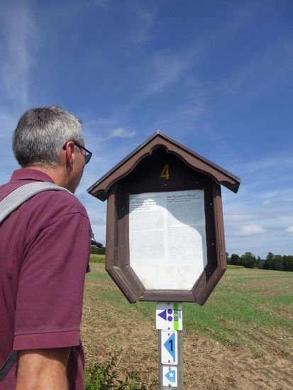 Durch ein Wohngebiet mit schmucken Einfamilienhäusern erreichen wir schließlich einen Rastplatz an der N418. Hier legen wir ein kleines Päuschen ein und verspeisen unser Rucksackvesper. Inzwischen sind die Temperaturen ganz ordentlich in die Höhe geklettert und auf uns wartet ein Aufstieg hinauf auf das Hoesdorfer Plateau. Also ist eine Stärkung dringend erforderlich, zumal mir meine neuen Wanderschuhe Probleme bereiten. Ich scheine mir eine ordentliche Blase zu laufen.....