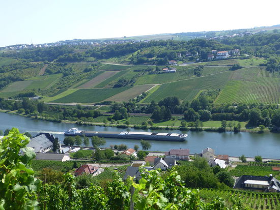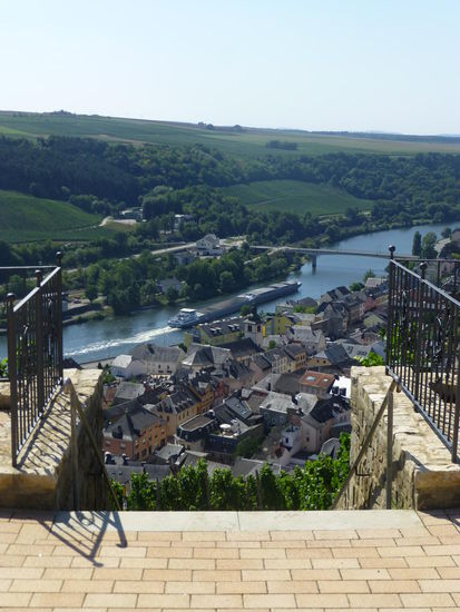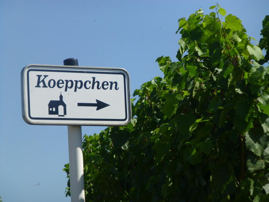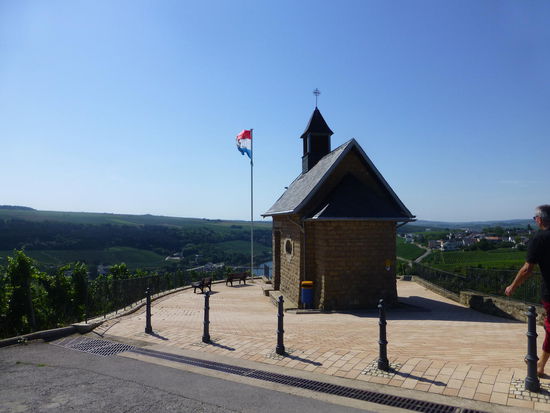 Bei Wormeldange fahren wir hinauf auf das "Koeppchen" und zur St.-Donatus-Kapelle. Die letzten Meter gehen wir zu Fuß durch die Weinberge und werden mit einer wunderbaren Aussicht auf das Moseltal belohnt. Wir sind wieder einmal mutterseelenallein hier oben. Der Bär steppt unten am Moselufer, wo sich Angler, Radfahrer, Biker und Sonnenhungrige treffen.
