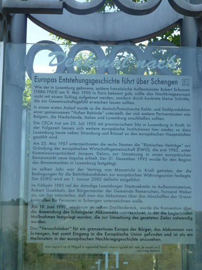 In Remich ist es dann so richtig voll. Die Menschen genießen den Sommertag auf der Flanierpromenade "Esplanade" an der Mosel, sitzen auf den Terrassen der Restaurants und nutzen die Picknickplätze am Moselufer zum Grillen und Sonnenbaden. Wir möchten uns da nicht ins Getümmel stürzen sondern fahren weiter bis nach Schengen. Wieder ein geschichtsträchtiges Terrain, wenngleich wir etwas enttäuscht vom Ort selbst sind. Berühmt wurde das Moseldorf am Dreiländereck Deutschland-Luxemburg-Frankreich 1985 durch die Unterzeichnung des Schengener Abkommens. Der Inbegriff eines grenzenlosen Europas scheint heute allerdings an einem Scheideweg zu stehen. Ich wünsche mir sehr, dass die Zukunft wieder bessere Zeiten für Europa als Gemeinschaft bringen wird.