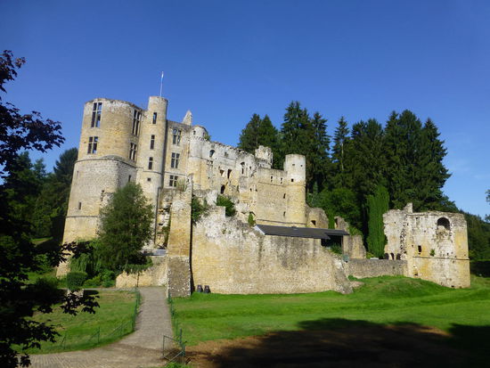 Nach dem Frühstück machen wir uns also auf den relativ kurzen Weg und steuern als erste Station das Schloss Beaufort an. Wir finden einen schattigen Parkplatz und können für die Dauer der Schlossbesichtigung unser Fellmonster im Auto lassen. Am heutigen Montag vormittag sind wir so gut wie alleine da. Streng genommen handelt es sich beim Château de Beaufort um eine Ruine. Eine Besichtigung ist trotzdem spannend und absolut gruselig ist die mittelalterliche Folterkammer.