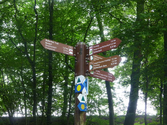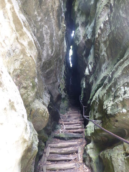 Oben auf dem Perekop, auf den man über eine enge, dunkle Felsenleiter gelangt, kommen wir irgendwie von unserer Wanderroute ab. Wir hätten wohl wieder absteigen müssen, aber schließlich erreichen wir dann doch auf anderen Wegen Halsbaach und von hier aus unseren Ausgangspunkt Berdorf. Allzu weit scheint der Umweg nicht gewesen zu sein, aber wir dürften etwa 8 Kilometer marschiert sein. Eine schöne Tour ohne große Herausforderungen, dafür mit Naturgenuss pur.