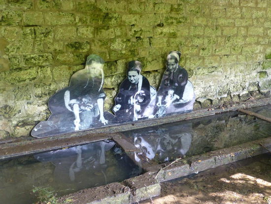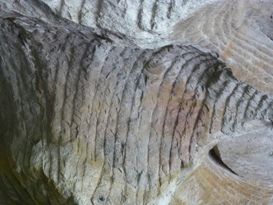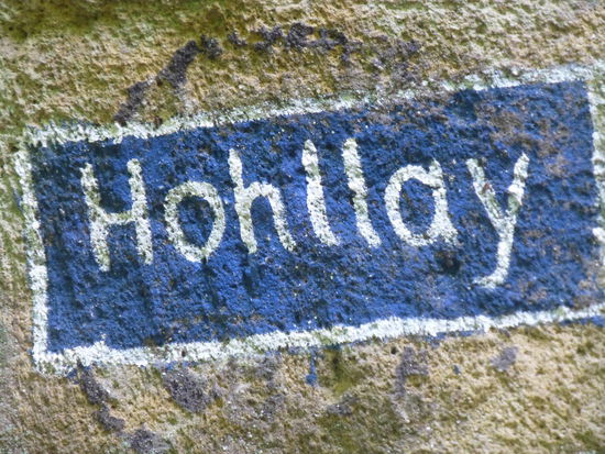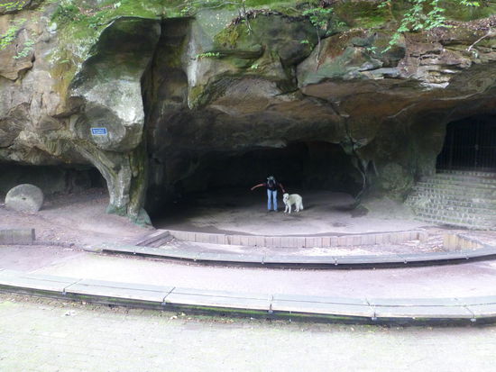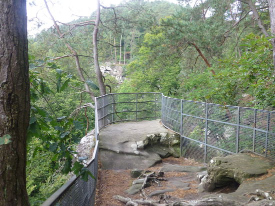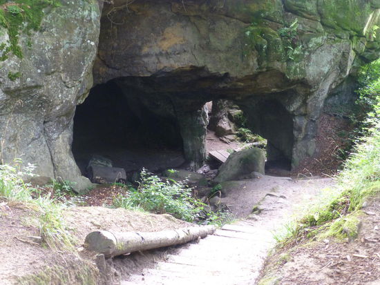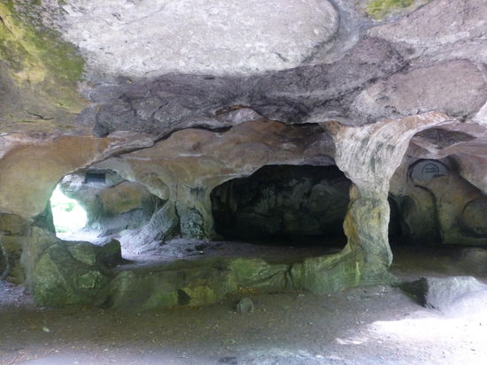 Über ein kleines Amphitheater, einer Felsgrotte, in dem während der Sommermonate auch Aufführungen zu sehen sind, gelangen wir zum Hohllay. Ein riesiger, ausgehöhlter Felsbrocken, aus dem einst Mühlsteine für die zahlreichen Mühlen der Gegend heraus gebrochen wurden. Die runden Ausschnitte in den Felsen kann man noch heute sehen.