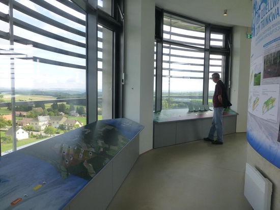 Zum Schluss erwartet uns noch ein besonderes Highlight: der Aqua-Tower in Berdorf. Hinter dem relativ profanen Wasserturm verbirgt sich ein tolles, touristisches Konzept. Besucher können auf die Aussichtsplattform des Turmes hinauf und von hier oben einen wunderbaren Rundumblick von den Ardennen zur Südeifel genießen. Außerdem ist eine interessante Ausstellung zur Geschichte und Technik der Trinkwasserversorgung der Region zu sehen und an besonderen Tagen lädt der Turm zum "Sundowner" bei einem Glas Sekt ein.