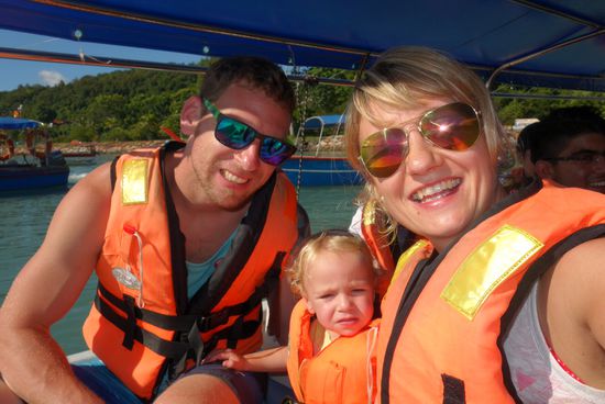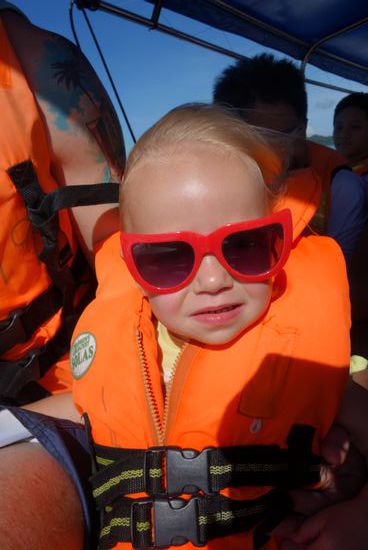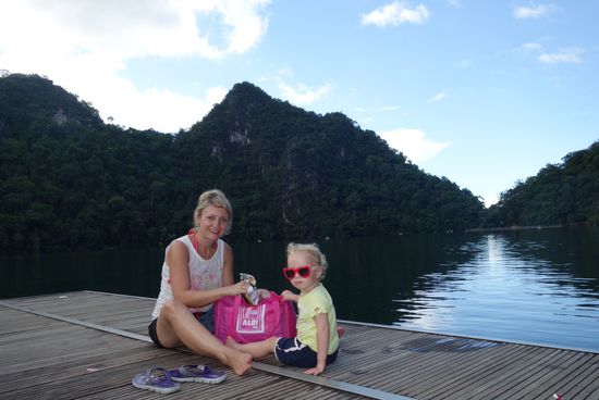 Bei erneut wunderschönem Wetter machten wir uns auf zum Islandhopping. Für schlappe 8 Ocken wurden wir 4h lang mit 20 Asiaten zu diversen Inseln rund um Langkawi geschippert. Wie schon von vorherigen Asiatrips bekannt, schwangen wir unsere Hinterteile grazil ins Longboat, gleich in die erste Reihe, da hat man ja bekanntlich die beste Sicht, und stellten uns mit Eleni auf eine gemütliche Kaffefahrt ein. Schwimmwesten an, und ab ging die Luzi. Mit 80 Sachen pesten wir volle Karacho um die idyllische Insellandschaft. Zunächst gings zu einem Süßwassersee zum Planschen. Bereits als wir am Pier ankamen, wurden wir von mehreren wilden Affen empfangen, Eleni fands natürlich klasse, wir die hungrigen Viecher allerdings nicht so ganz. Zitat: "Diese Idioten geben den Viechern doch tatsächlich Ihr Mittagessen! Typisch Touris!"Auf dem Rückweg schließlich holten wir uns, völlig hungrig, passend zur Lunch-Time, ein paar Snacks. 3x dürft ihr Raten wer's gegessen hat? In Bruchteilen von Sekunden war die Tüte in Affenhänden und der Klügere gibt bekanntlich nach... Typisch Touris eben