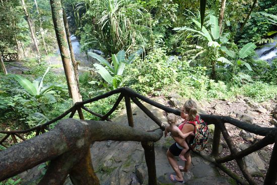 Voller Tatendrang und grenzenloser Spontanität (im Vergleich zu Woche 1) klingelte unser Wecker am nächsten Morgen um 8! Uhr. Unser Ziel: die Bergbahn mit Hängebrücke, ein Highlight von Langkawi. Dort angekommen, trauten wir unseren Augen nicht: Menschenmassen noch und nöcher. Inzwischen sind hier malayische Ferien und Feiertage noch dazu. Da müssen auch die Malayen mit Kind und Kegel raus und unbedingt was unternehmen. Ganz spontan packten wir wieder unsere Sachen und gingen zum nahegelegenen Wasserfall zum Baden.