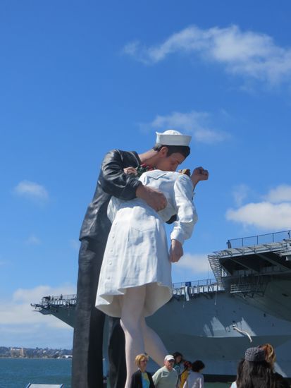 Um 04:30 Uhr, kurz vor dem Wecker, schlugen wir topfit die Augen auf - endlich hatte der Jetlag auch mal etwas Positives . Mit unserem 20$ Gutschein gönnten wir uns ein leckeres Frühstück bei „Au Bon Pain“ mit Cream Cheese Bagels (juhu, da sind sie wieder), Schokocroissants, Cookies, Obstsalat, Kaffee und O-Saft bevor wir problemlos in unseren nächsten Flug eincheckten. Trotz fehlendem Unterhaltungsprogramm verging auch dieser Flug recht schnell, die meiste Zeit lasen wir oder genossen die ersten Ausblicke auf die faszinierende Wüstenlandschaft unter uns – unfassbar wie groß und weitläufig hier alles ist. Nach dem Aussteigen in San Diego erwartete uns die nächste Überraschung – der Flughafen war gesperrt, die Polizei lies uns ohne nähere Erklärung nicht an die Kofferbänder. Nach einer halben Stunde war der Spuk vorbei, wir schnappten uns unsere Koffer und schnupperten das erste Mal kalifornische Luft – hallo Sonne, lang nicht mehr gesehen . Mit dem Shuttlebus ging es zur Dollar Mietwagenstation, wo Jan sich von den Angestellten ein Upgrade auf ein weißes Ford Mustang Cabrio aufschwätzen lies (kleine Sünden bestraft der liebe Gott bekanntlich sofort – noch am gleichen Abend hatte Jan ein feuerrot verbranntes Genick ). Nach wenigen Minuten Fahrt erreichten wir unser Motel Kings Inn auf dem Hotel Circle etwas außerhalb des Zentrums. Dort teilte man uns mit, dass unser Zimmer erst ab 16:00 Uhr frei wäre, die einzige Möglichkeit wäre ein Früh-Checkinn für 10$ Extragebühren. Wir ärgerten uns sehr, schließlich wären wir eigentlich bereits gestern angekommen und haben die verpasste Nacht ja auch bezahlt – unser Zimmer muss somit definitiv frei gewesen sein. Aufgrund der erneuten Zeitverschiebung zwischen Philadelphia und San Diego war es gerade mal 11:00 Uhr morgens und somit zu früh um auf das Zimmer zu warten. Also zogen wir in unseren vom Flug verschwitzten Klamotten in dicken Jeans und Pulli los. San Diego war jedoch so traumhaft schön, dass aller Ärger schnell vergessen war! Zuerst fuhren wir in das Old Town, dem alten Stadtzentrum von San Diego und erkundeten dieses Viertel zu Fuß. Sandboden, Kakteen, alte Holzhäuser, kleine Saloons, 20 Grad Celsius, blauer Himmel und strahlender Sonnenschein – wir waren von der ersten Sekunde an begeistert! Seems it never rains in southern California ! Überall spielten mexikanische Musiker, Straßenstände verkauften selbstgemachte Tortillas für 1$. Westernfeeling mit mexikanischem Flair – genauso hatten wir es uns vorgestellt. Wir genossen jede Minute, setzten uns mit einer Tortilla in die Sonne auf eine Parkbank. Weiter ging unsere Erkundungstour über den 59mile Scenic Drive (dies ist eine Rundfahrt durch die ganze Stadt, die alle Sehenswürdigkeiten miteinander verbindet) zum Balboa Park. Dieser rießige Stadtpark ist wirklich hübsch angelegt mit vielen bunten Blumen und verschnörkelten Gebäuden. Uns war hier jedoch entschieden zuviel Trubel, weshalb wir recht zügig weiter an den Hafen fuhren. Hier erwischten wir eine noch laufende Parkuhr und konnten uns somit kostenfrei das Maritime Museum anschauen – mehrere alte Segelschiffe & U-Boote lagen am Hafen und konnten besichtigt werden. Besonders spannend war der USS Midway Flugzeugträger, den wir aufgrund der hohen Eintrittspreise jedoch auch nur von Außen bestaunten. Im Seaportvillage bekamen wir leider keinen freien Parkplatz mehr, kehrten deshalb um und fuhren den Scenic Drive am Meer entlang, vorbei am enorm lauten Flughafen (im Cabrio hatte man das Gefühl die Boings bei der Landung berühren zu können) bis zur Harbour Island. Diese kleine vorgelagerte Insel war durch eine schmalen Straße mit dem Festland verbunden und bestand nur aus einer einzigen Straße, die rechts einen Bootsanlegeplatz, einige Hotels & Fischrestaurants und links Grünanlagen mit schönen Picknickplätzen bot. Wir setzten uns ins Gras und genossen den Blick auf das Meer und den gegenüberliegenden Sea Cruise Hafen. Weiter folgten wir dem Scenic Drive, vorbei an Shelter Island (einer weiteren vorgelagerten kleinen Insel) und dem Point Loma in den Cabrillo Nationalpark. Dieser war zwar im Vergleich zu den noch Folgenden recht klein, aber dafür umso schöner. Zerklüftete Felsen, grüne Wiesen, der alte Leuchtturm – so stellten wir uns Irland vor! Am Eingang erstanden wir problemlos wie geplant den „America the beautiful anual Pass“, mit welchem wir für einmalig 80$ ein Jahr lang alle Nationalparks der USA besichtigen können. Unsere Fahrt führte uns immer höher, vorbei am Fort Rosecrans National Cemetery, ein US Nationalfriedhof mit 102.000 Soldatengräbern. Die unzähligen weißen Grabsteine auf den rießigen grünen Wiesen, die links und rechts in Richtung des dunkelblauen Meers abfielen, boten einen wirklich außergewöhnlichen Anblick, ebenso wie die atemberaubende Aussicht auf den Hafen und das Festland. Auf dem Gipfel angekommen besichtigten wir zuerst das Cabrillo-Monument, das zu ehren Juan Rodríguez Cabrillo errichtet wurde, der als erster Europäer die Westküste der USA erreichte. Zeitgleich freuten wir uns, den südwestlichsten Punkt der USA erreicht zu haben (in Erinnerung an den südlichsten Punkt der USA vor knapp 4 Monaten). Auf dem Rückweg machten wir einen kleinen Schlenker vorbei an den Sunsetcliffs, wo gerade eine Hochzeit im Freien stattfand – das Brautpaar blickte während der Trauung direkt auf´s Meer und den langsam einsetzenden Sonnenuntergang – wunderschön! Wir machten uns auf den Weg zurück an unser Hotel und checkten nun endlich ein. Das Kings Inn ist ein klassisches amerikanisches Motel, Pool in der Mitte, Parken vor der Tür, Einrichtung spartanisch und etwas älter. Endlich konnten wir uns duschen und unsere ersten Sonnenbrände begutachten (Cabrio + knallende Sonne + kühler Wind am Meer = heftiger Sonnenbrand im Nacken und auf dem Scheitel). Danach ging unsere Besichtigungstour direkt weiter, wir fuhren in das Gaslampq