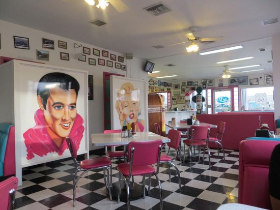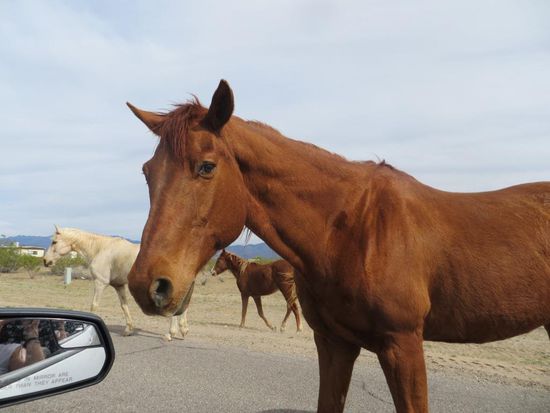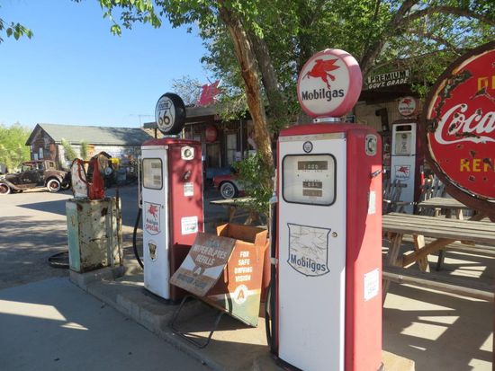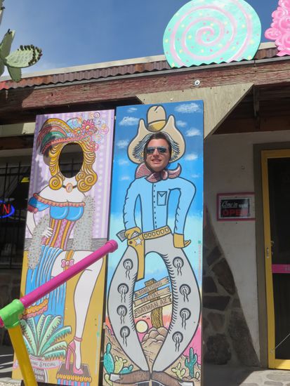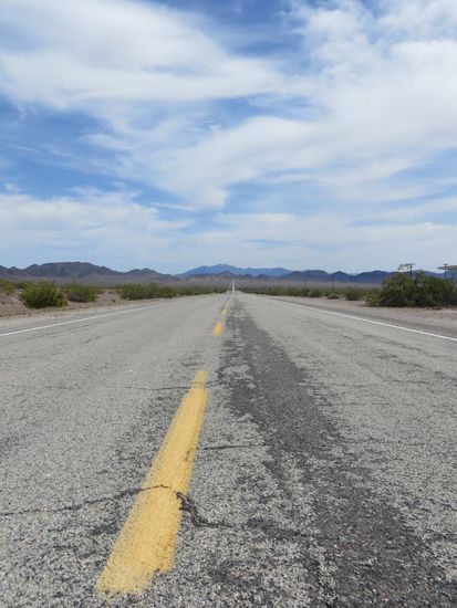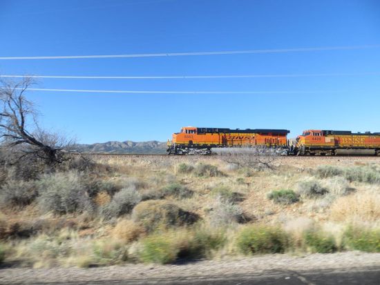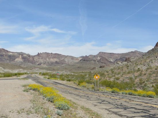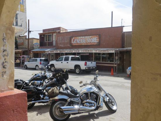 Nach diesen frühsportlichen Aktivitäten fuhren wir weiter in die Wüste hinein. Die Landschaft wurde zuerst immer trockener und sandiger, dann fuhren wir über hohe Bergpässe und durch enge Schluchten hindurch. So langsam machten wir uns in diesem Niemandsland doch etwas Gedanken um unseren Tank, hatten wir die Warnungen grundsätzlich bei jeder Gelegenheit vollzutanken doch nicht ganz so ernst genommen… Teilweise kam uns 30 Minuten lang kein einziges Auto entgegen, einmal trabten gemächlich einige Wildpferde auf der Straße entlang und waren nicht gewillt uns Störenfrieden Platz zu machen. Glücklicherweise hatten wir immerhin genügend Wasservorräte dabei, denn auch die Temperaturen stiegen in dieser Wüstenlandschaft immer höher. Am Wegesrand sahen wir immer wieder einzelne Briefkästen und konnten uns kaum vorstellen, dass in den Tiefen der Wüste tatsächlich irgendwo dazugehörige Häuser waren. Wer konnte/ wollte hier leben?! In bizarr anmutenden Trailerparks lebten die verbliebenen Indianer, kleine Wohnwagensiedlungen mit Pferden vor der Tür. Wir passierten große Salzabbauflächen und standen dann plötzlich auf einer geteerten Querstraße mit der Aufschrift „Route 66“. War das aufregend – die bekannteste Straße der Welt lag vor uns. Und glücklicherweise begann sie mit einer (wenn auch etwas veralteten) Tankstelle. Zum absoluten Wüsten-Wucher-Preis tankte uns ein alter Mann mit Cowboyhut eigenhändig voll, zahlen konnte man hier völlig US-untypisch nur in bar. Dann ging es weiter – get your kicks on Route 66 . Das Feeling auf der „mother road“ zu fahren war toll und auch die verfallenen Diner und Tankstellen am Wegesrand, die abgeknickten Leuchtreklamen und verlassenen Autowracks passten zu dieser Kulisse. Leider war auch die Straße selbst sehr marode und bestand stellenweise fast nur noch aus Bitumen – nicht unbedingt die besten Voraussetzungen für die vielen Harleyfahrer… Wir passierten unsere erste Staatengrenze, verließen Kalifornien und kamen nach Arizona. Nach insgesamt etwa drei Stunden Fahrt kamen wir in Oatman an, eines der Dörfer, die sich ihr ursprüngliches Route 66- Feeling noch erhalten hatten. Wir spazierten ein wenig durch das Dorf, das ziemlich touristisch aufgemacht, aber dennoch sehr hübsch war. Herumlaufende Esel wurden mit Karotten gefüttert, vor den Saloons saßen Harleyfahrer bei einer Cola, neben dem alten Postoffice konnte man im General Store Souvenirs erstehen. Nach einer eiskalten Coke fuhren wir weiter nach Kingman. Diese Stadt an der Route 66 ist deutlich größer und nicht nur für Touristen gemacht, hier leben sehr viele Menschen. Wir bezogen das überraschend schöne und saubere Quality Inn Motel mit großen Zimmern, Parkplatz vor der Tür, einer tollen Einrichtung mit unzähligen Route 66 Souvenirs, Frühstück – und das alles zu einem Spotpreis von 38 Euro pro Zimmer! Wir schauten uns den Ort an und waren begeistert vom „neuen“ Route 66 Lebensgefühl, den schönen restaurierten Oldtimern und den unfassbar langen vorbeirauschenden Güterzügen. In einem neonpink eingerichteten Diner mit schwarz-weißem Schachbrettoden und Bildern von Marilyn und Elvis an den Wänden aßen wir leckere Spareribs, holten uns im Supermarkt noch ein Eis und Getränke und ließen den Tag entspannt ausklingen.