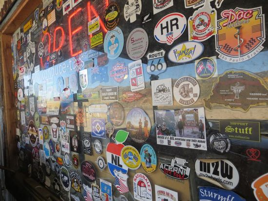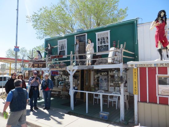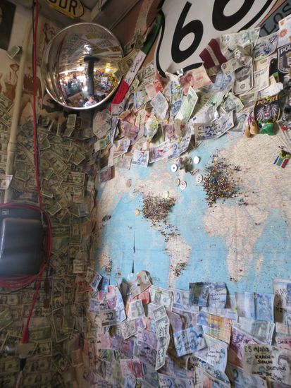 Halbzeit – und was hatten wir bislang schon alles gesehen und erlebt – Wahnsinn! Nach einer recht ruhigen Nacht frühstückten wir auf der Terrasse des Motels ein typisch amerikanisches Frühstück und fuhren danach die Route 66 entlang bis nach Williams. Unterwegs stoppten wir am Hackberry General Store – eine echt coole Institution an der Route 66! Alte Coca Cola Truhen, Kuhschädel, Kakteen, Oldtimer, retro Zapfsäulen, alte Straßenschilder – der Besitzer hat ein wahres Sammelsurium an Route 66 Erinnerungsstücken zusammengetragen. In seinem Laden verkaufte er Cowboyhüte, kühle Getränke und eine rießige Auswahl an Souvenirs. Die Wände waren mit Stickern & Buttons jeglicher Harleyclubs die hier jemals vorbeikamen beklebt, an den Decken hingen Kfz-Kennzeichen von Besuchern aus der ganzen Welt. Auf einer großen Weltkarte konnten sich Besucher mit einer Stecknadel an ihrem Wohnort markieren oder signierte Dollarnoten festpinnen. Man konnte sich stundenlang auf diesem Gelände aufhalten und entdeckte immer wieder etwas Neues. Wir trugen uns ins Gästebuch ein und erstanden einen Magnet für unseren Kühlschrank und eine Kappe für Jan´s Papa. Unseren nächsten Halt machten wir in Seligman, welches sich selbst als „Geburtsstätte der historischen Route 66“ bezeichnet. Weltweite Bekanntheit erlangte der Ort durch die Brüder Delgadillo, die hier einen Friseursalon und ein Schnellrestaurant betreiben und durch diverse amerikanische TV-Shows einen echten Kultstatus erreicht hatten. Das spürten wir leider auch an den Besucherzahlen – 4 deutsche & französische Reisebusse kamen zeitgleich mit uns an und schossen Fotos von den bunten Läden und Kneipen – das war definitiv zuviel für uns! Kurzerhand kauften wir noch ein Route 66 Biker-Shirt für Tatj´s Papa und machten uns schnell wieder auf den Weg. Williams war dagegen ein recht ruhiger Ort mit vielen tollen Bars und Steakhäusern.