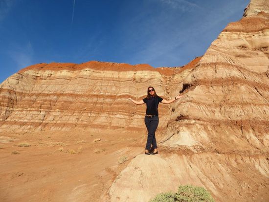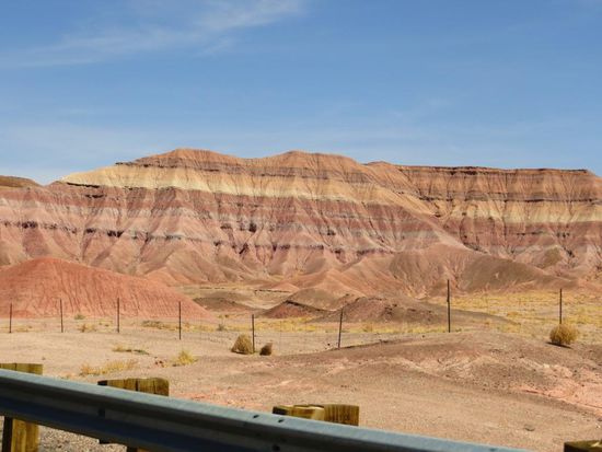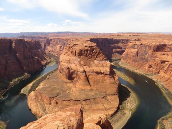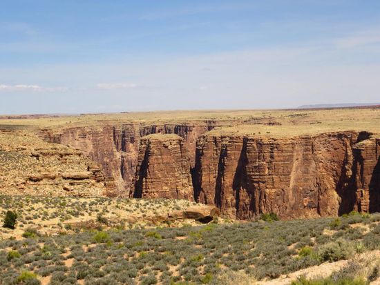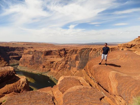 Nach dem Verlassen des Nationalparks machten wir uns auf den Weg in Richtung Page, dem einzigen Ort am Lake Powell. An einem schönen Aussichtspunkt unterwegs hielten wir kurz an, ein Indianer hatte hier einen kleinen Stand aufgebaut und verkaufte handgemachten Schmuck. Während Tatj sich die bunten Ketten und Armbänder anschaute, kamen wir mit dem Mann ins Gespräch. Der Indianer war wirklich sehr nett und berichtete uns, nachdem wir ihm erzählten wo wir hin wollten, dass der Highway 89 nach einem Erdrutsch eingebrochen war und wir einen sehr großen Umweg fahren müssten. Auf einer Karte zeigte er uns die offizielle Detour und empfahl uns eine Abkürzung. Wir waren zugegebener Maßen etwas skeptisch – wollte er uns nur am nächsten Souvenirstand vorbeischicken? Doch er sollte recht behalten, der Highway war gesperrt, die Bilder im Netz von der zerstörten Straße verheerend. Wir folgten der offizielle Detour und bogen dann auf die vom Indianer empfohlene Abkürzung ab. Und wieder hatte er recht – die Straße entpuppte sich zwar nach einiger Zeit zu einer Sand-/Schotterpiste, doch der Umweg wurde durch sie deutlich kürzer. Insgesamt benötigten wir für die Fahrt nach Page statt der geplanten 2 Stunden, 4 Stunden, doch die Landschaft im Navajo-Indianergebiet (dem zweitgrößten Indianerstamm der USA) war so schön, dass das für alles entschädigte. Wir kamen an Bergen und Hügeln vorbei, die so bunt gestreift waren, dass es wirklich wie angemalt aussah - absolut einmalig! In Page angekommen steuerten wir zuerst den Horseshoe Bend an. Vom Parkplatz aus liefen wir ca. 1 Km zu einem großen Loch im Boden. Dort angekommen verschlug es uns die Sprache – 300 m tiefer floss der Colorado River in Hufeisenform um einen Felsen herum – ein unfassbares Bild! Jetzt endlich waren wir richtig geplättet – ein unglaublicher Anblick! Zurück in der Stadt checkten wir im Rodeway Inn, einem netten günstigen Motel mit eigener Terrasse ein. Leider kam plötzlich ein kühler Wind auf und durchkreuzte unsere Pläne, den restlichen Tag am Pool oder See zu verbringen. So machten wir uns kurzerhand auf den Weg in den Glen Canyon Nationalpark. Zuerst schauten wir uns den Glen Canyon Dam an, der den Lake Powell, nach dem Lake Mead, zum zweitgrößten Stausee der USA aufstaut. Danach fuhren wir in den Glen Canyon Nationalpark hinein, außer dem See an sich gab es hier jedoch nicht viel zu sehen. Wir fragten am Hafen nach einer Möglichkeit Jetskis auszuleihen, allerdings hatten wir vor wenigen Metern unbemerkt die Grenze nach Utah überschritten und dadurch eine Stunde Zeit verloren – es war bereits zu spät um sich noch etwas auszuleihen. Nicht weiter tragisch – ein Blick auf die Preise und die Windverhältnisse Draußen und uns verging die Lust daran sowieso recht schnell. Zurück im Hotel machten wir uns frisch und fuhren ins Dam Plaza, einem tollen Steakhouse, wo wir sehr lecker zu Abend aßen. Als Nachtisch gab es ein üppiges Apple-Sahne-Eis-Kuchen-Irgendwas und Tatj bekam sogar noch ein Kompliment von der Kellnerin „I love your smell, is it Coco?“ Den Abend liesen wir dann gemütlich mit einer Runde Kniffel auf unserer Terrasse ausklingen.