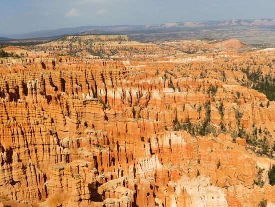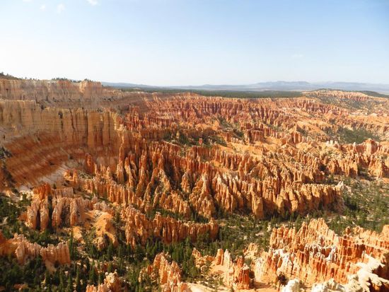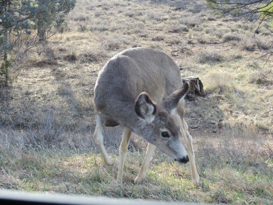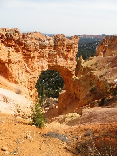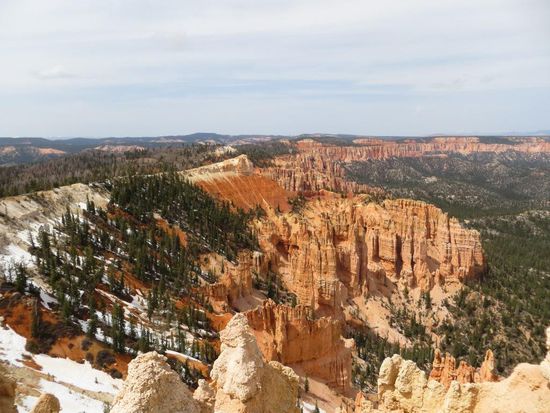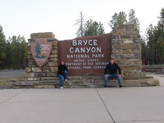 Auf einer Höhe von 2.700 m erreichten wir schlussendlich den Bryce Canyon Nationalpark, in dem stellenweise sogar noch Schnee lag. Die Sonne schien jedoch warm auf uns herab und wir machten uns gleich auf den Weg in den Nationalpark hinein. Durch den dichten Wald verläuft eine lange Straße mit vielen Aussichtspunkten entlang der Canyons. Die Wanderwege befinden sich hier nur im Backcountry, das heißt man hat von ihnen keinen besonders guten Ausblick auf das Amphitheater. Wir fuhren zuerst bis zum Rainbowpoint, dem südlichsten Aussichtspunkt, durch und ließen uns dann für den Rückweg viel Zeit. Immer wieder liefen wir ein Stückchen in den Wald hinein und begegneten dabei Präriehunden, Springhörnern, irgendwelchen Deers (Rehe mit rießigen Ohren) oder neonblau gefiederten Vögeln. Nur den Black Bear suchten wir vergeblich . Wir schauten uns den Black Birch Canyon, den Agua Canyon und den Ponderosa Canyon an, bestaunten die Natural Bridge und den Swamp Canyon. Dann näherten wir uns dem Amphitheater mit den berühmten goldenen Hoodoos. Von den verschiedenen Aussichtspunkten wie Inspiration- oder Bryce Point hatten wir eine tolle Aussicht auf diese und diesmal faszinierte uns der Anblick der seltsam geformten Gesteine, die jeden Moment einzustürzen drohten, viel mehr als im Grand Canyon. Gegen Abend checkten wir im direkt vor dem Nationalpark gelegenen Best Western Ruby´s Inn ein, dem einzigen Hotel weit und breit. Unser Zimmer bezogen wir in der Ponderosa Ranch, alles war passend rustikal im Westernstil eingerichtet. Um dem Trubel und den hohen Preisen im Hotelrestaurant zu entgehen machten wir uns auf die Suche nach einer anderen Essensmöglichkeit, im Umkreis von knapp 50 Km gab es jedoch nur eine kleine Bäckerei und einen Subway. Uns reichte das vollkommen aus, zum Abendessen gab es Footlong-Subs und Schokocookies. Später fuhren wir noch einmal in den Nationalpark hinein zum Sunsetpoint, doch das mit dem Sonnenuntergang wurde wieder nichts, diesmal lag es allerdings nicht am Wetter, sondern am Aussichtspunkt, dessen Name sehr irreführend war – einen Sonnenuntergang konnte man hier jedenfalls nicht schauen, die ging auf der anderen Seite hinter den Bäumen unter, weshalb die Hoodoos alle bereits im Schatten lagen und einfach nur dunkel wurden… Der kleine Spaziergang war trotzdem schön und wir konnten noch einmal viele Tiere beobachten. Den Tag beendeten wir dann mit einem Bummel durch die Souvenirshops unserer Hotelanlage.