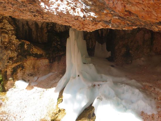 Entgegen aller Vorhersagen lag Draußen noch kein Schnee als wir aufwachten, es war jedoch mit 6 Grad Celsius deutlich kühler als gestern. In der kleinen Bakery holten wir uns frisch gebackene Zimtschnecken und heißen Kaffee und beschlossen noch ein wenig zu wandern. Wir fuhren zum Mossy Cave Trail, einem ca. 1-stündigen Roundtrip. Leider führte der Wasserfall aktuell fast kein Wasser, die Wanderung am Bach entlang machte trotzdem Spaß. In den Hanging Gardens sahen wir sogar tatsächlich noch einige Eisgletscher. Plötzlich begann es dann doch leicht zu Schneeregnen. Da weder wir, noch unser Cabrio auf solches Wetter vorbereitet waren, machten wir uns schnell auf den Weg in tiefere Gefilde.