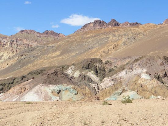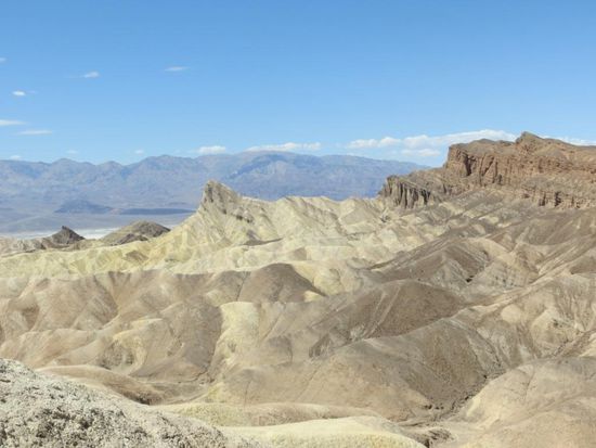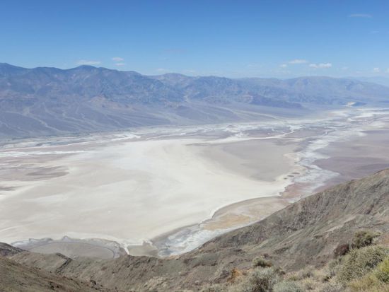 Death Valley ist rießig groß und es war selbst Anfang April mit über 40 Grad Celsius extrem heiß, der Wind, der einem entgegen schlug, war wie ein Fön. Wir fuhren zum 1.670 m hoch gelegenen Dante´s View Aussichtspunkt mit spannendem Blick über die ausgetrockneten Salzseen, zum Zabriskie Aussichtspunkt mit Blick auf die bizarren Erosionslandschaften, besichtigten das Badwater Basin, den mit 85.5 m unter dem Meeresspiegel gelegene tiefste Punkt der USA und bestaunten die durch Mineralien bunt gefärbten Felsen und Salzpfannen. Hier gab es wirklich keinerlei Leben mehr, nur Sand und Stein, kein einziger Busch, alles war extrem ausgetrocknet. Im Devils Golf Course war die salzige Erde so trocken aufgerissen, dass sie 40 cm tiefe Furchen in den Boden grub. Ein schmaler spannender Artist´s Scenic Drive führte uns durch die bunten Mineralienberge - dann konnten wir nicht mehr, es war einfach zu heiß.