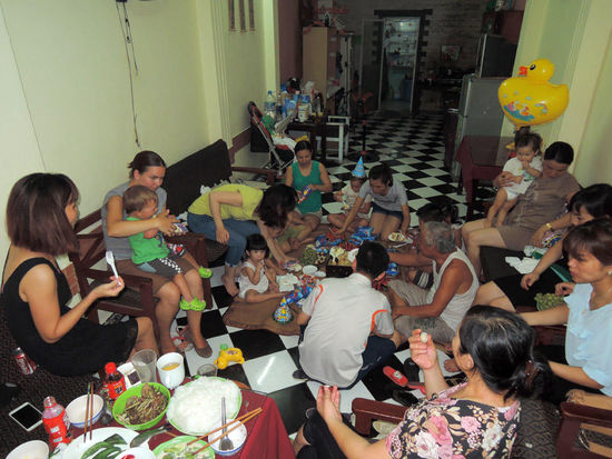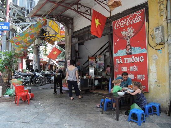 Wir blieben in den Gassen vom alten Hanoi und fanden schnell das Old Quarter Cyclo Hotel. Ein schmales, hohes, süßes Häuschen mit einem freien, sauberen Zimmer für uns, mit großem Fenster und zwei Queensize-Betten. Und dazu gab es noch Spielkameraden für Fine und Willi - die Kinder von der herzlichen Hoteliersfamilie lebten auch hier. Und ein herrliches Frühstück - und das alles für 15€ pro Nacht für 4 Personen, inklusive Familienanschluss mit Geburtstagsfeier