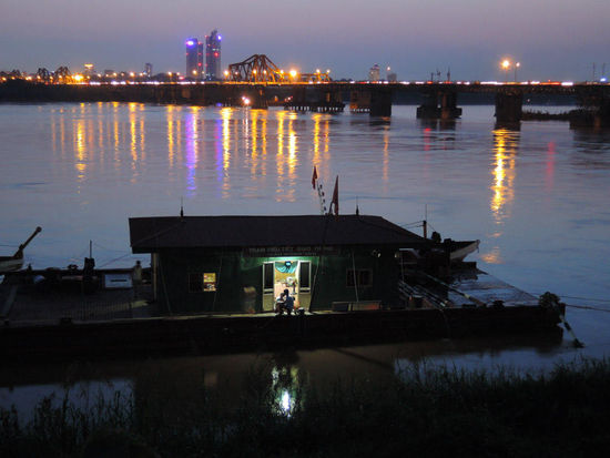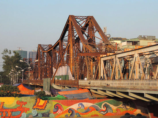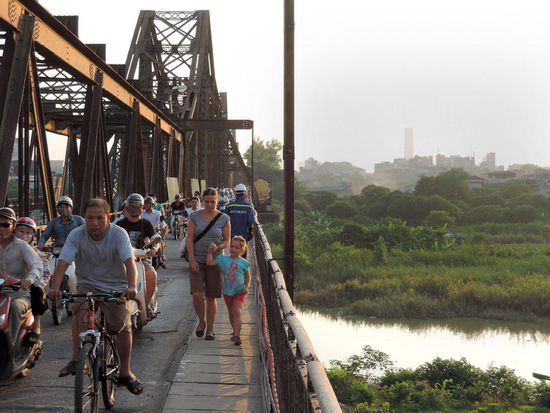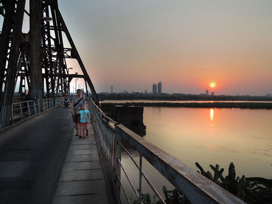 Da war es wieder. Eines der Probleme, die eine Mutter hat, wenn sie ihre Kinder in Gefahr sieht aber der Papa komplett anderer Meinung ist. Also, Männer voraus und Fine mit Mama im großen Abstand hinterher (Fines Hand klebte dabei regelrecht an Mamas Hand fest und drohte wohl schon blau anzulaufen - was nicht an Fine lag). Vor uns erstreckte sich ein Highlight Hanois - die Long Biên Brücke. Von hier aus genießt man den schönsten Sonnenuntergang mit Blick auf Hanoi - stand im Reiseführer. Wir freuten uns auf die Flussromantik. Für Mirko: Höhepunkt des Tages (mit Kamera + Stativ) - für Anja: 2,4 km Höllentrip mit Schweißausbrüchen - für die Kinder: Abenteuer pur.