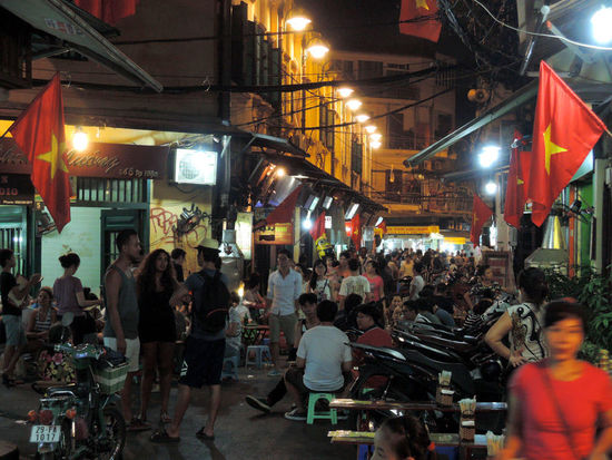 Von den 15 Restaurants, die malerisch am Ufer lagen, hatte keines eine englische Speisekarte, keine Bilder vom Essen und es verstand auch niemand englisch. Was sollten wir denn nur essen? Einfach raten? Alle hatten Hunger, Willi war nass und wir hatten verdammt noch mal einen stressigen Anmarsch über die Brücke bis hierher. Trotz mehrerer Versuche bei verschiedenen Restaurants - keine Chance. Mittlerweile war es stockfinster und wir befanden uns in einer Ecke von Hanoi, die wir nicht kannten und in der es wohl auch keine Touristen gibt. Meist sind die Menschen in solchen Ecken viel freundlicher, aber hier fühlten wir uns gar nicht wohl. Also, schnell ein Taxi anhalten und ab über die Autobrücke in unser Viertel. Das Taxi war schnell gefunden, unser Ziel - Hanoi Altstadt - einfach zu verstehen und gut zu finden (am anderen Ende der Brücke noch 50 m, dann können wir aussteigen). Das sah unser Taxifahrer anders. Einmal falsch abgebogen, gab es kein Zurück mehr. Trotz Anweisungen von Mirko nutzte er die nächste Chance zum Wenden nicht und fuhr wieder falsch. Keine Absicht. Er kannte sich nicht aus und telefonierte wild mit seinem Chef. Statt 25.000 Dong (1 €), stand auf unserem Taximeter nun 89.000 Dong (3,50 €) - hier in Vietnam ein riesiger Unterschied. Hungrig und genervt zahlten wir nur 25.000 Dong, nahmen die Entschuldigung des Fahrers an und ließen uns durch den Trubel der bunten Gassen vom Old Quarter Hanoi treiben.