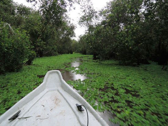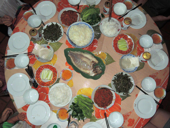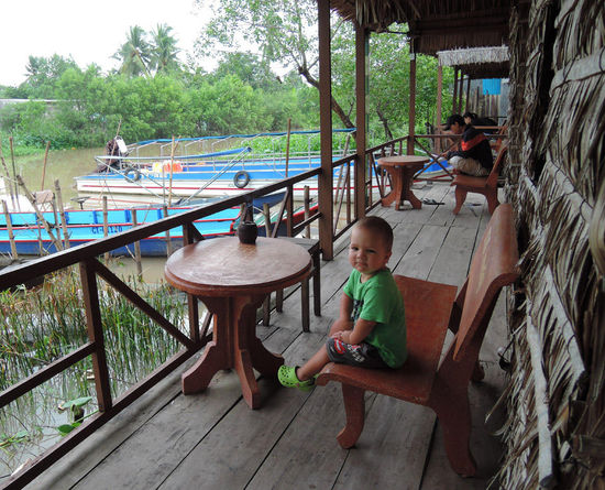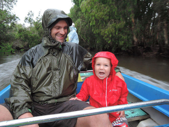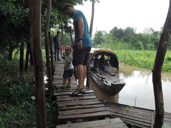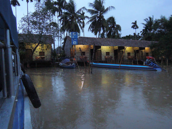 Bei starkem Regen kamen wir mit unserem Boot fast im Dunkeln an. Zum ersten Mal für die Kinder übernachteten wir in einem Homestay, das sind einfachste Unterkünfte bei einheimischen Familien. Wir ließen uns die selbst zubereiteten Frühlingsrollen und andere Köstlichkeiten schmecken. Fine war Meisterin im Rollen und Willi war Meister im Essen. Wir saßen mit vier deutschen Backpackern gemeinsam am Tisch und genossen es uns seit langem mal wieder mit anderen in Deutsch auszutauschen. Kurz vor dem Schlafengehen gingen Mirko und Fine mit Lampe auf Entdeckungstour und fanden allerlei "Krachmacher" und Krabbeltiere im finsteren Wald rings um unsere urige Hütte aus Palmwedeln.
