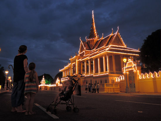 Die Zahnsache war schnell überstanden. Überaus fähige Zahnärzte bauten in Windeseile eine passende topmoderne Krone und lösten so sämtliche schmerzende Probleme. Jetzt noch schnell ein Busticket für die Weiterreise kaufen und raus aus Phnom Penh. Ach nee. Da waren ja noch die Feiertage, die uns überrumpelten. Und dazu kam noch der australische Hotelinhaber, der uns davon abriet, erst Ende Dezember nach Australien zu fliegen, da es dann unerträglich heiß sein würde und die Hochsaison auch steigende Preise mit sich führte. So ließen wir uns gezwungener Maßen ein paar Tage Zeit. Wir besuchten den Königspalast und entdeckten den größten Spielplatz den wir je gesehen hatten, mitten in Phnom Penh, am Königspalast.