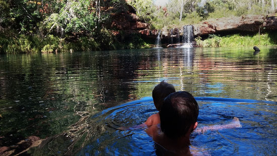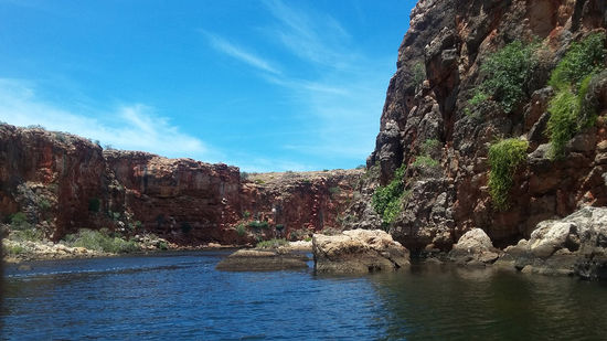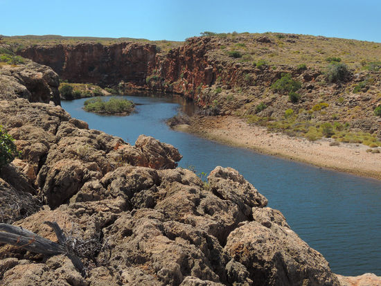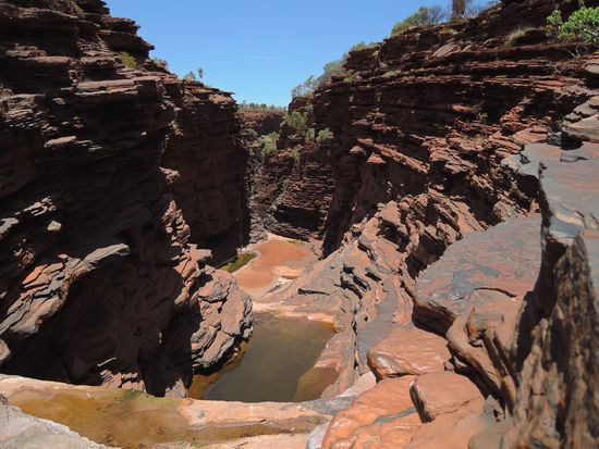 Nach 10 Tagen Küste und Strand zog es uns wieder Richtung Outback, in die Berge und Schluchten des Karijini Nationalparks. Schon der Weg dorthin übertraf mit seiner großartigen Natur alle anderen Nationalparks, die wir bisher gesehen hatten. Wir verbrachten eine Nacht auf einer Farm und erlebten am frühen Morgen die Eintreibung und Verladung von hunderten Rindern auf zwei dieser riesigen über 50m langen Roadtrains. Aufgrund der starken Hitze tagsüber (damals bis 48 Grad) beschränkten wir uns auf die schattigen Wanderwege. Wir fanden versteckte Wasserfälle und magische Plätze zum Baden.