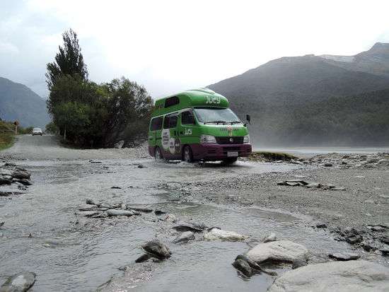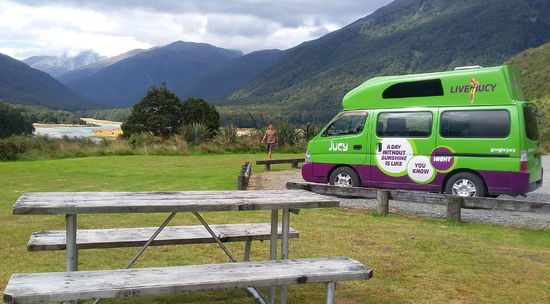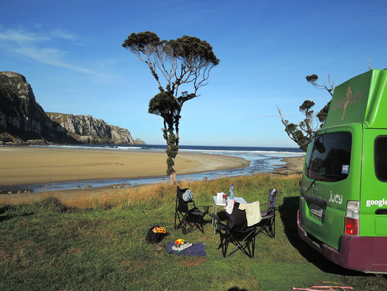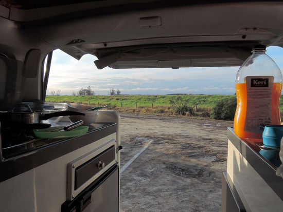 Auf unser Leben im Campervan freuten wir uns (nach fast 3 Monaten im Zelt) riesig. Jetzt wird alles bequemer und einfacher, dachten wir. Aber so ein Leben auf Rädern in Neuseeland hat auch seine Tücken. Wir räumen trotzdem jeden Tag hin und her. Kisten wandern auf die Vordersitze. Beutel und Taschen müssen irgendwo verstaut werden, um etwas Bewegungsfreiheit im Inneren zu schaffen. Verschiedenste Dinge werden irgendwo angehangen, um es so einfach wie möglich zu gestalten. Und dennoch suchen wir. Jeden Tag. Irgendwas fehlt oder liegt nicht dort, wo es sein sollte. Klar, kann man auch ein viel größeres Wohnmobil mieten, das kostet aber auch viel mehr. Für uns nicht machbar.