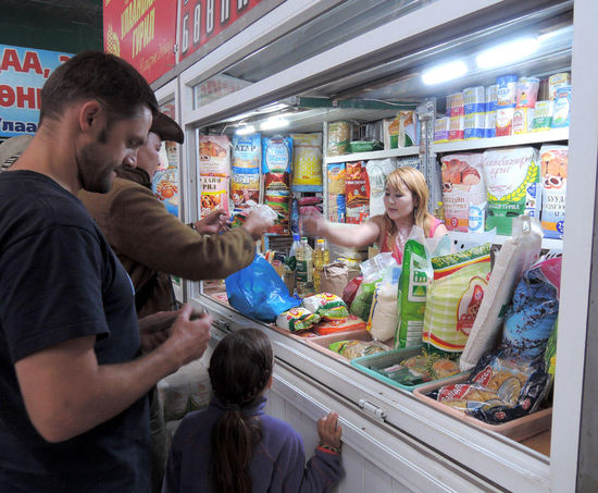 Am nächsten Morgen brachen wir dann endlich auf in unser Abenteuer, abseits der Städte, um das Leben der Nomaden hautnah zu erfahren. Die Abfahrt zog sich bis in den späten Vormittag, da wir noch an einem mongolischen Großmarkt hielten, um Lebensmittel für den Notfall (ja, die Mongolei ist sehr dünn besiedelt) und Gastgeschenke (Zucker, Mehl, Obst, Tabak, Bonbons, Streichhölzer, Bier, Vodka …) zu besorgen. Auch hier wären wir ohne Guide schnell an unsere Grenzen gestoßen. Weder was, noch wieviel, noch wo wir einkaufen sollten, hätten wir allein nicht gewusst.