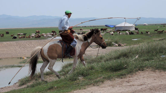 Wir fuhren weiter durch die unendlichen Weiten der Mongolei – über Wiesen, durch Flüsse, vorbei an Bergmassiven und immer mit freiem Blick bis zum Horizont, ohne Zäune, Häuser und Menschen. Selten begegneten uns andere Autos. Ab und an sahen wir Reiter und immer wieder Herden von Ziegen, Schafen, Pferden, Kühen und Yaks. Hier und da standen vereinzelt Jurten von Nomaden. Wenn es nötig war, hielten wir an einer Jurte und fragten nach dem Weg (hier auf dem Land gibt es keine Straßenschilder). Prompt wurden wir eingeladen und fanden uns auf dem Ehrenplatz der Jurte wieder mit Tee, vergorener Stutenmilch und getrockneten Quarksticks in der Hand. Dank Zula erfuhren wir sehr viel über die Familien und das Leben auf dem Land. Er bewahrte uns auch vor so manchen mongolischen „Fettnäpfchen“, und davon gibt es viele (z.B. Jurte immer mit dem rechten Bein zuerst betreten oder die gereichte Stutenmilch in der Jurte niemals direkt an den Nachbarn weiterreichen, sondern immer zuerst an die Gastgeber zurück – MIT BEIDEN HÄNDEN). Wir verteilten unsere Gastgeschenke und reisten schon bald weiter. Immer wieder begleitet durch den wundervollen Gesang und Kehlkopfgesang der beiden Mongolen im Auto.