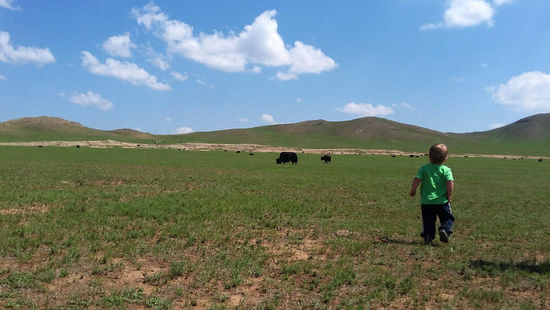 Der Moment, der uns völlig faszinierte und unser Mongoleifieber so richtig entfachte, ließ nicht lange auf sich warten. Erst begannen die beiden vor uns voller Inbrunst mit tiefer mongolischer Stimme die „Goldene Strasse“ zu besingen (ein Ritual bei Reisebeginn) und wenige hundert Meter entfernt von der befestigten Straße, auf Sandwegen, die uns zu unserem ersten Camp führten, musste Baagi den Wagen stoppen. Vor uns auf dem Weg und links und rechts auf den Wiesen weidete eine große Yakherde. Unsere ersten Yaks!!! Unser erster Stopp außerhalb der Stadt. Kaum hielt der Jeep, gingen die Türen auf und wir atmeten die frische Luft. Es roch nach den verschiedensten Kräutern. Ein Gras, dass wir überall in der Mongolei fanden, duftete nach einer Mischung aus Rosmarin, Salbei und Minze. Das ist für uns nun der typische Geruch, der uns mit diesem Land verbindet. Noch heute haftet er an unseren Schuhsohlen. Willi genoss die Freiheit und rannte lachend über die Wiesen. Er war nicht mehr zu stoppen. Fine schwärmte in die andere Richtung aus und versuchte nah an die Yaks zu kommen und die aufgescheuchten Heuschrecken zu fangen. Wir Erwachsenen genossen den fantastischen Blick und den wunderbaren Geruch von purer Natur um uns herum.