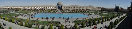 Schon vor der Anlage der Residenz von Shah Abbas befand sich hier eine Art Marktplatz am Eingang zum Bazar, der Naqsh-e Jahan „Abbild der Welt“ genannt wurde. Abbas liess ihn ausbauen und bedeutend vergrössern auf die gigantischen Ausmasse von 524 x 160 m. Rings um den Platz verlaufen doppelstöckige Arkaden mit einem gleichmässigen Bogenmass. Im Untergeschoss waren und sind noch heute die Arbeitsstätten der Handwerker und Geschäfte. Die Obergeschosse tragen Blendarkaden und wurden nur wegen des räumlichen Eindrucks angebracht.