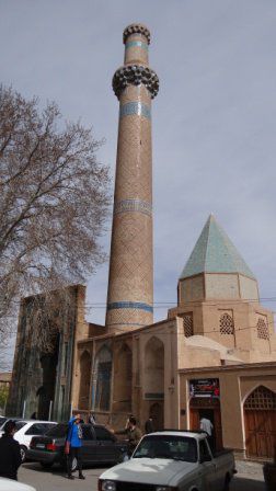 Bei schönem aber kaltem Wetter verlassen wir Isfahan und fahren nach Natanz, am Fusse des knapp 3900 m hohen Kuh-e Karkas. Schon in sassanidischer Zeit war es ein beliebter Jagdgrund für die damaligen Herrscher. Heute ist Natanz ein beliebter Marktfleck in einer Höhe von 1565 m. Unweit des Zentrums, schon von weitem sichtbar, liegt die Freitagsmoschee mit ihrem hoch aufstrebenden Minarett. Das Portal vom Anfang des 14. Jh. besitzt besonders schöne Fliesenpartien und Schriftbänder.