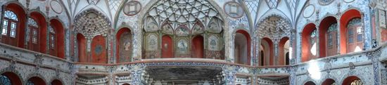 Nach der Durchquerung des Innenhofes wenden wir uns nach rechts und erreichen nach 50 m das Khane-ye Tabataba’i, das Haus eines wohlhabenden Kashaner Kaufmann, welches im 19. Jh. erbaut wurde. Auch hier folgt die Anordnung der Gebäude dem bekannten Plan, ein öffentlicher, ein privater und ein Trakt für das Personal bilden das knapp 5000 m2 grosse Ensemble. Auch hier hinterlassen die erlesenen Dekorationen aus Stuck, Spiegeln und Fenstern einen bleibenden Eindruck bei uns.